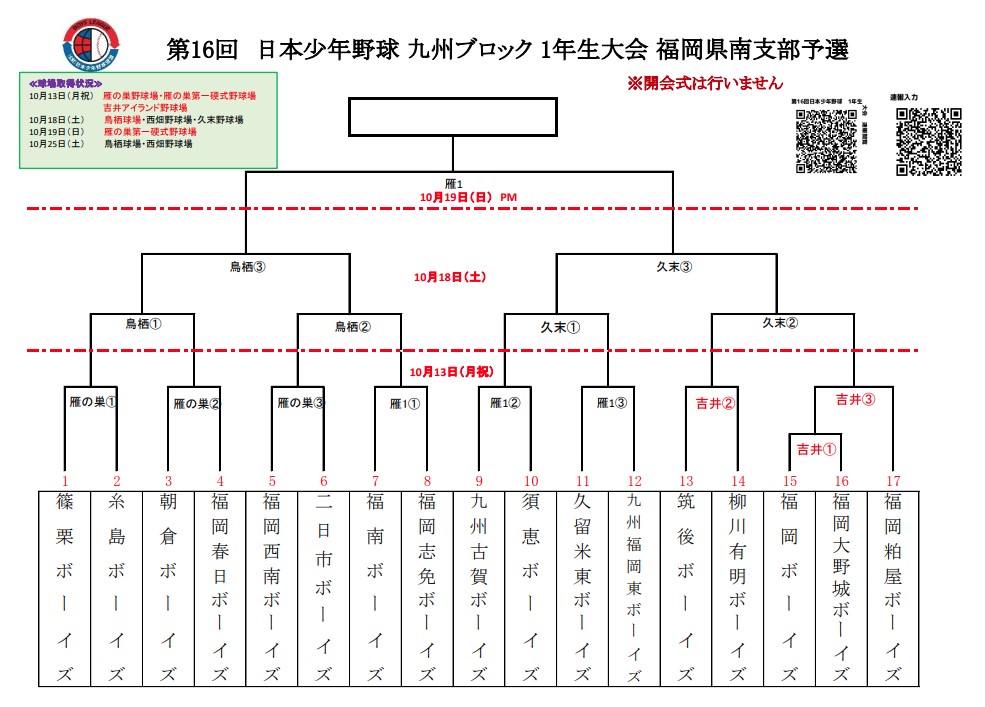 第16回日本少年野球九州ブロック1年生大会 福岡県南支部予選の組み合わせです。