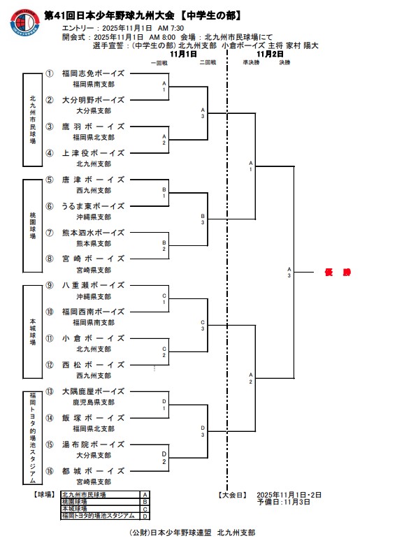 第41回日本少年野球九州大会の組み合わせ(中学硬式)