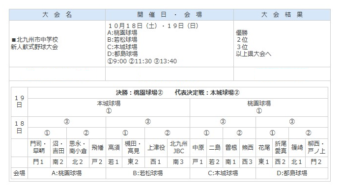 北九州市中学校新人軟式野球大会の組み合わせです。