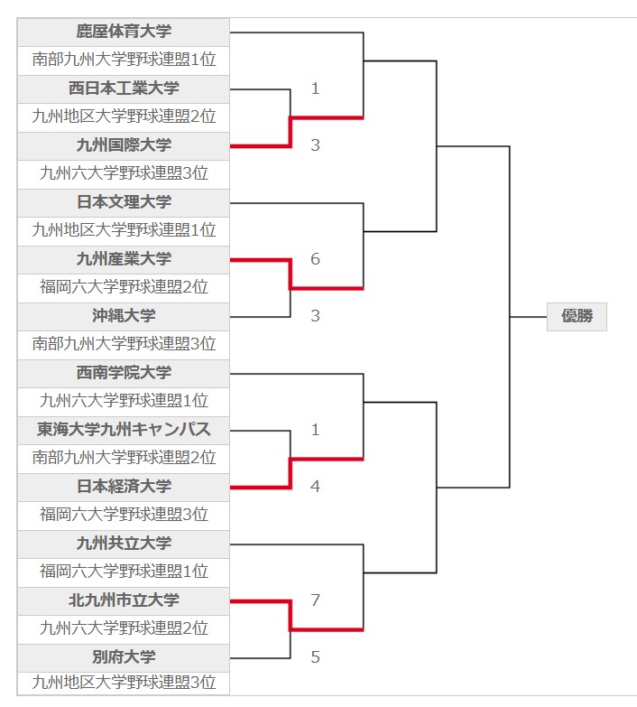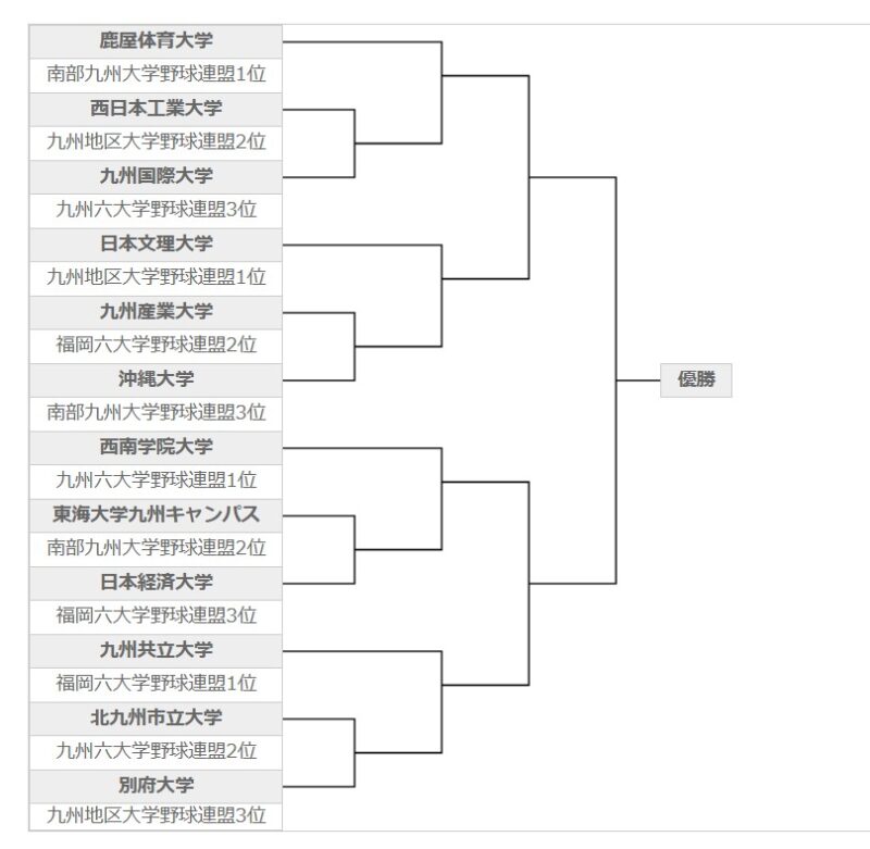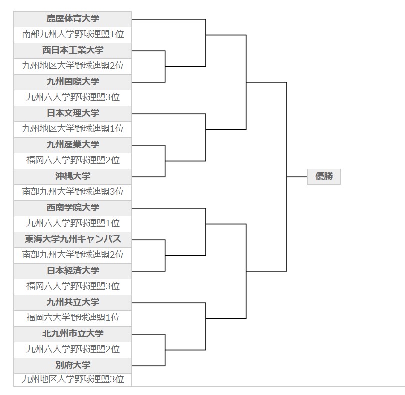 令和7年度(2025)第32回全九州大学野球選手権大会第56回明治神宮野球大会九州四連盟代表決定戦の組み合わせ(大学硬式) 福岡野球大会情報 2025.10.23 10月25日(土)から筑豊緑地などで開催される令和7年度(2025)第32回全九州大学野球選手権大会第56回明治神宮野球大会九州四連盟代表決定戦の組み合わせです。優勝目指して頑張ってください!