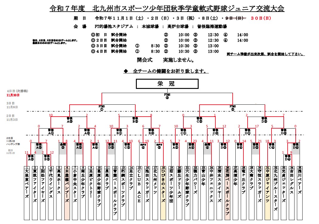 令和7年度 北九州市スポーツ少年団秋季学童軟式野球ジュニア交流大会の途中結果です。