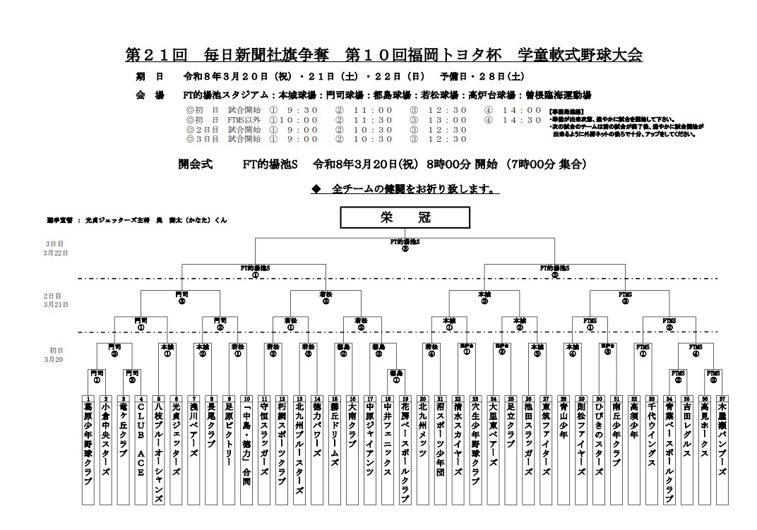 第21回毎日新聞社旗争奪第10回福岡トヨタ杯学童軟式野球大会の組み合わせ(学童軟式)