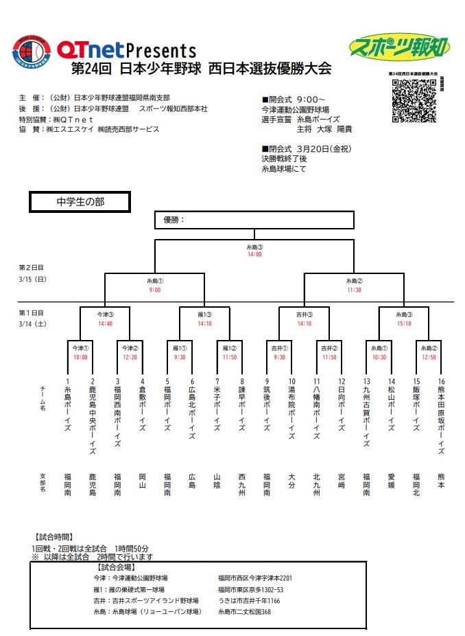 第24回 日本少年野球 西日本選抜優勝大会の組み合わせです!