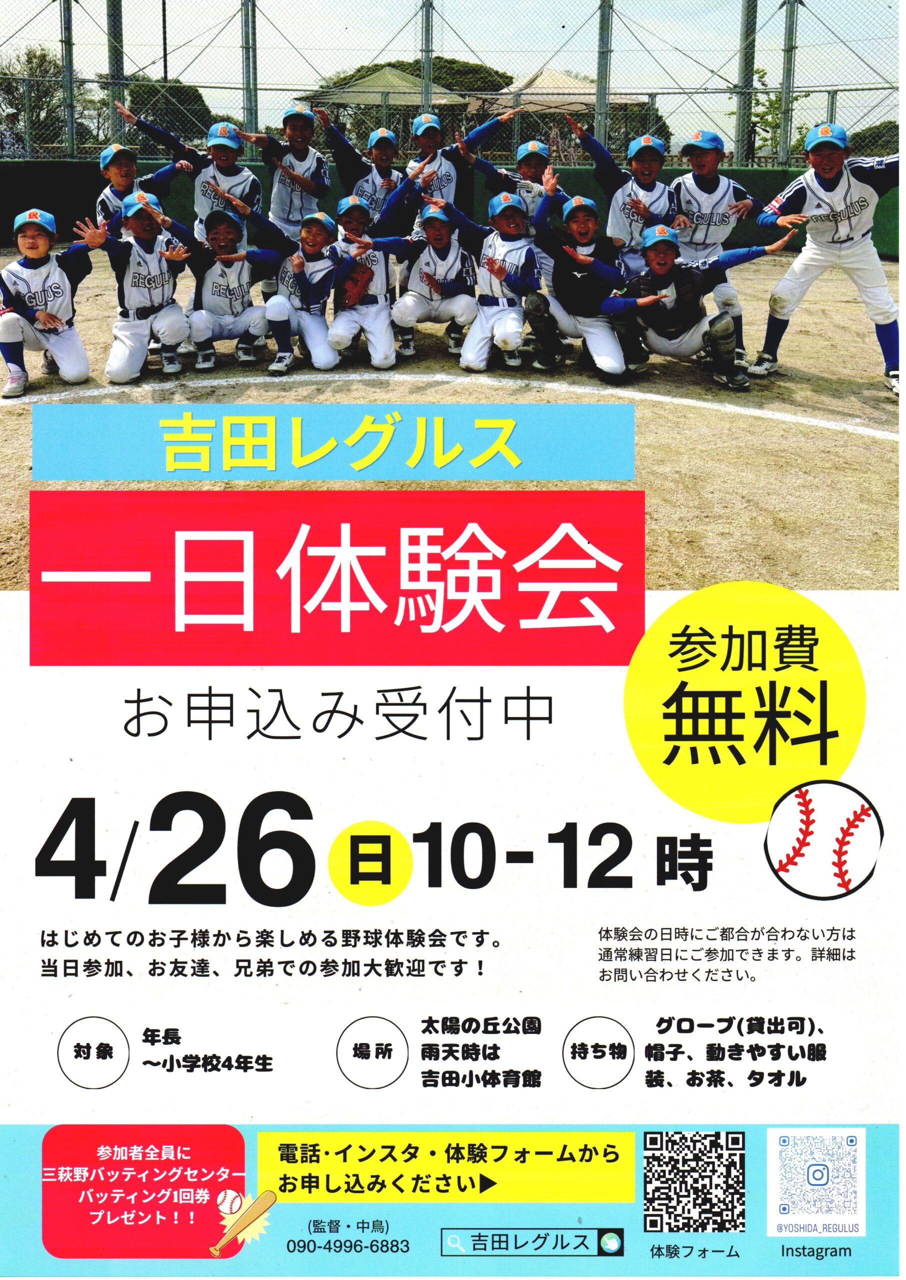 電話、インスタグラム、ポスター内にあるQRコードの体験フォームからお申込みください。