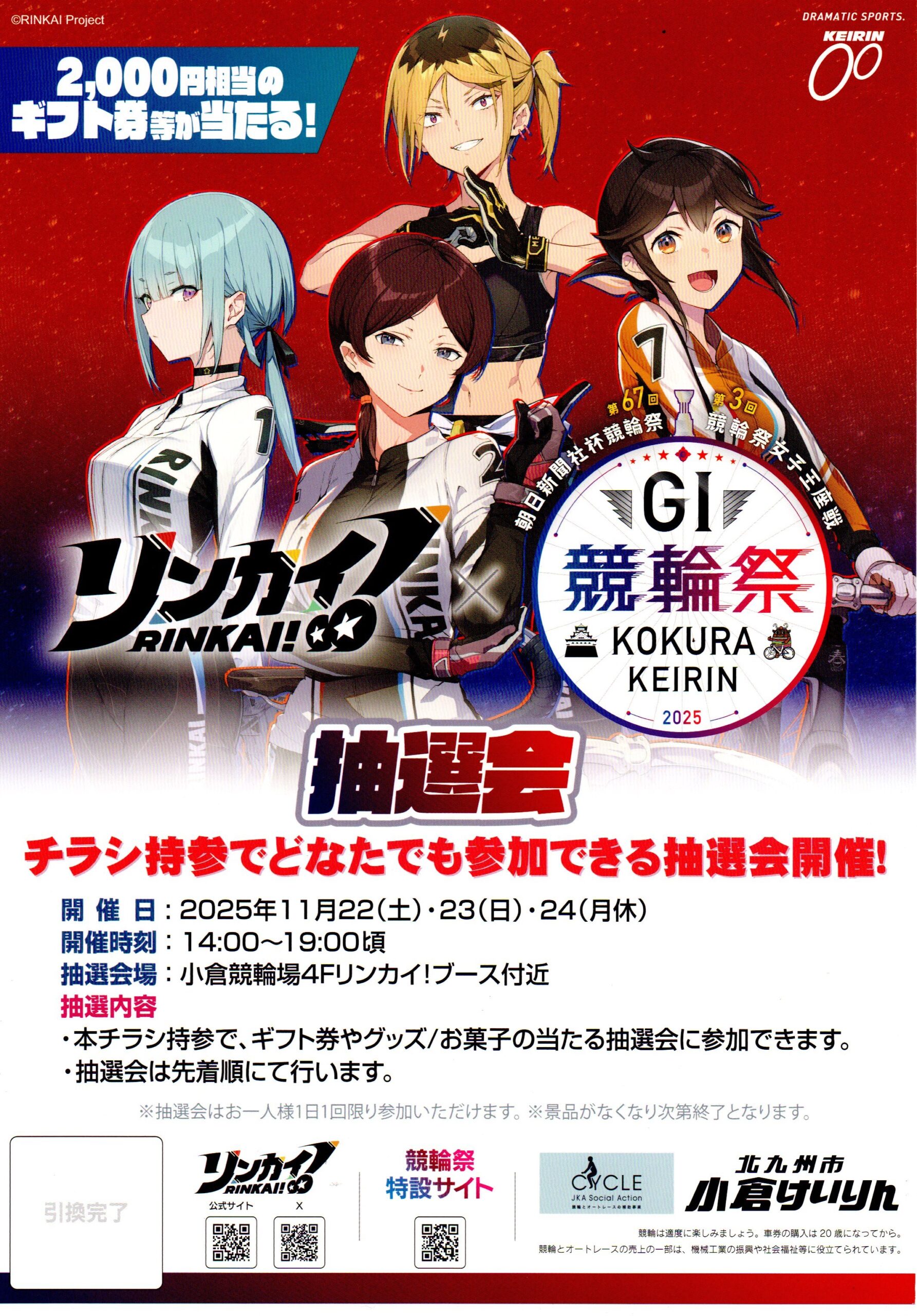 If you bring one of these flyers to Kokura Velodrome between Saturday, November 22nd and Monday, November 24th during the Keirin Festival, you can participate in a prize lottery to win gift certificates, merchandise, or snacks!