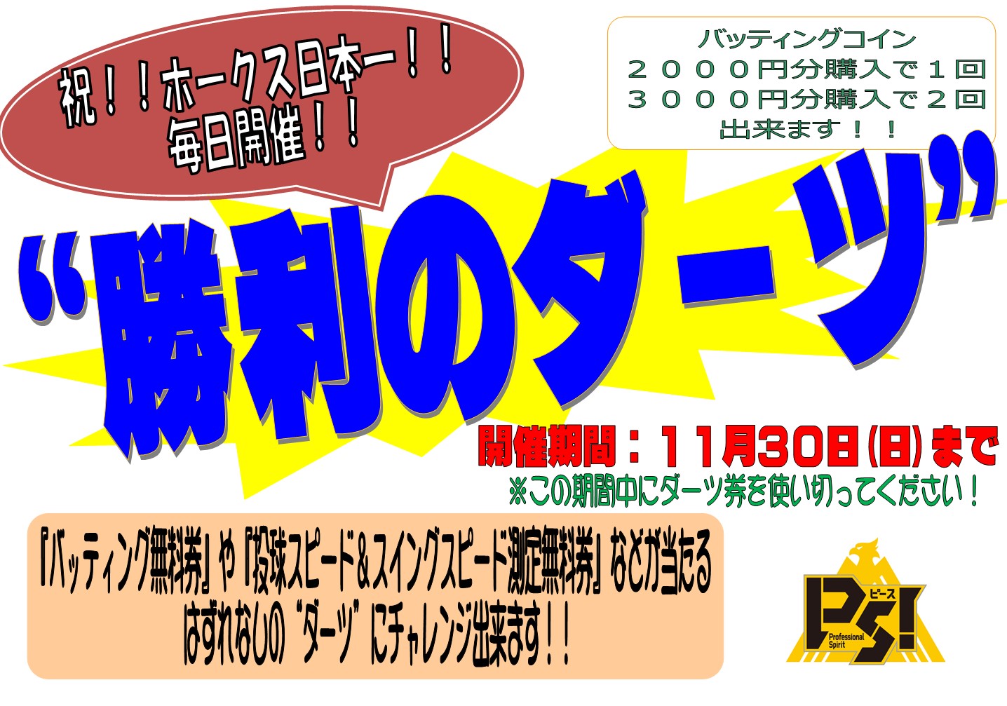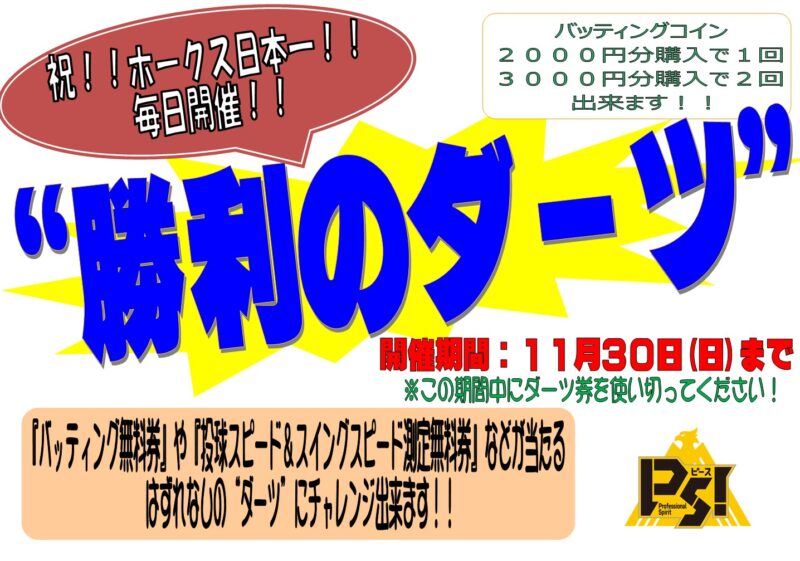 ホークスの日本一を記念して「日本一おめでとうダーツ」を開催します!!