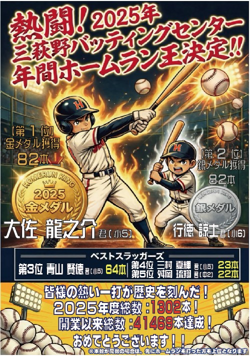 2025年度年間ホームラン王は大佐 龍之介君(小5)総数82本でした。