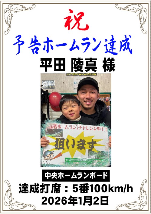 5番打席100キロのマシンから中央のホームランボードに当てられ、見事予告ホームランを達成しました!おめでとうございます!