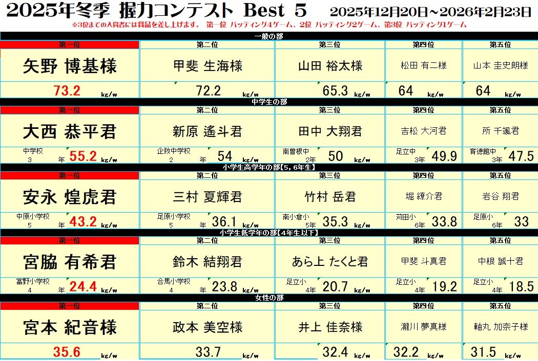 These are the results of the 2025 Winter Grip Strength Contest Ranking, held from Saturday, December 20, 2025 to Monday, February 23, 2026 (National Holiday).