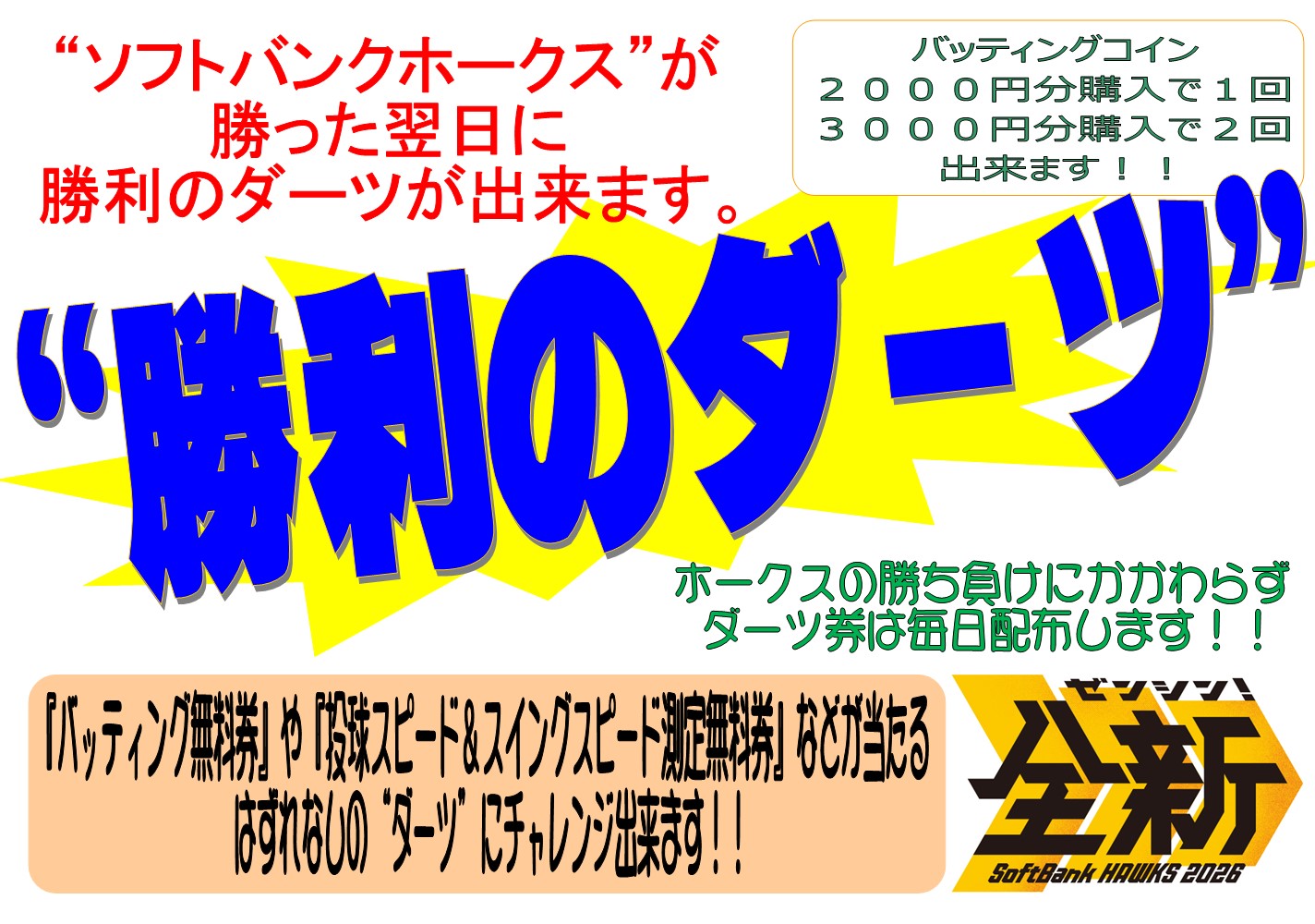 ホークスの勝ち負けに関わらずチケットは配布しますが、ダーツが出来る日はホークスが勝った翌日となります!