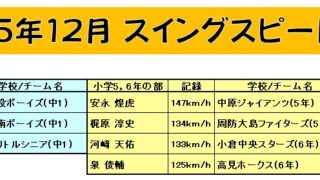 ★12月度スイングスピード王総合の部 野本洸志 様 159Km/h中学生の部 中村勇飛 君 142Km/h 上津役ボーイズ(1年)小学5-6年の部 安永煌虎 君 147Km/h 中原ジャイアンツ(5年)小学低/女性の部 藤本翔 君 96Km...全文はクリック
