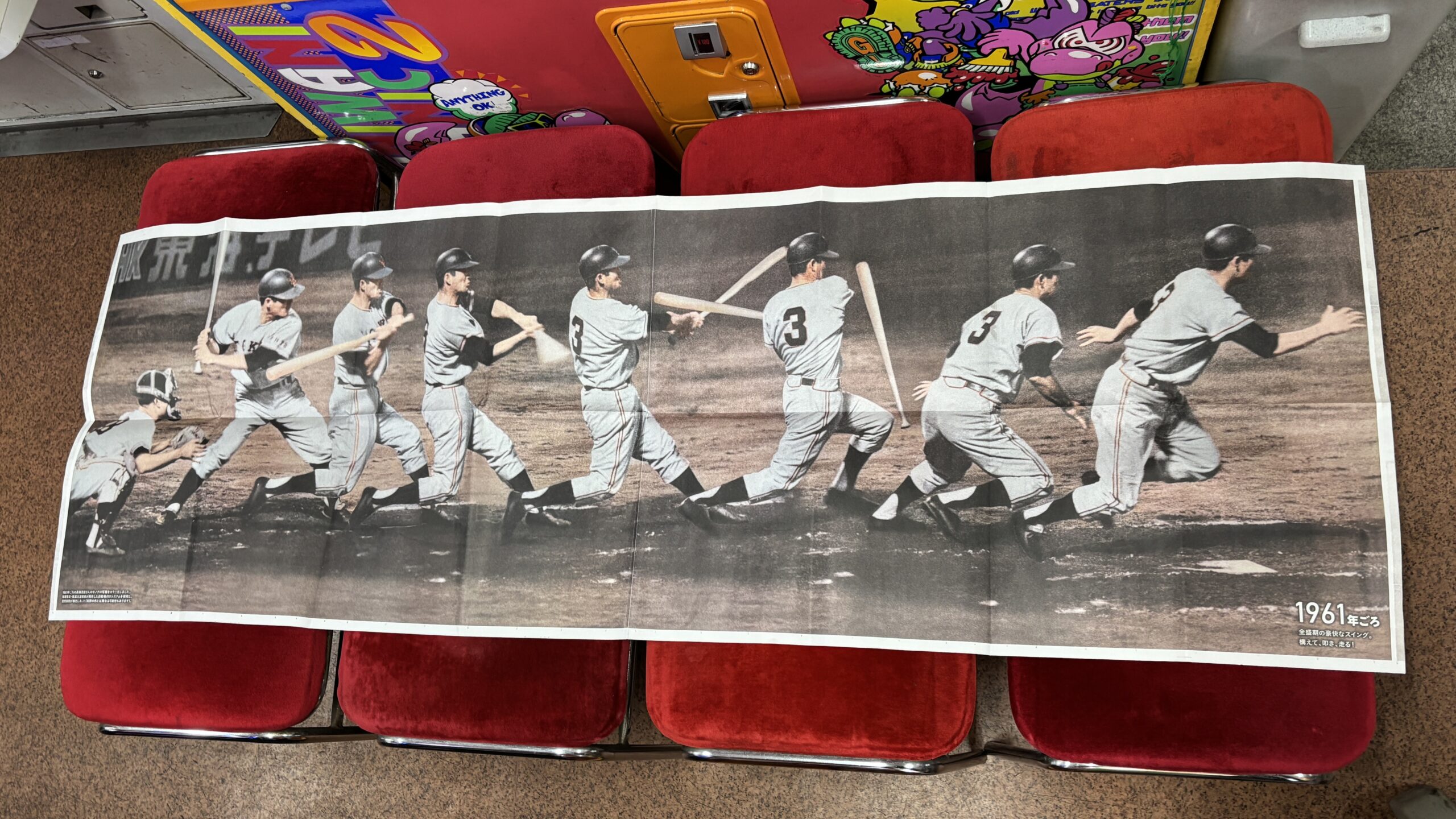 6月3日に逝去した長嶋茂雄氏の追悼取材を受けたときの記者さんから「この度このようなものができました。取材のお礼に。」と、三萩野バッティングセンターに持ってきてくれました。160cm×55cmのと新聞紙4枚を連ねた特大の紙面には長嶋さんの連続写真と裏面には輝かしい年表が印刷されたファン垂涎の一品です。