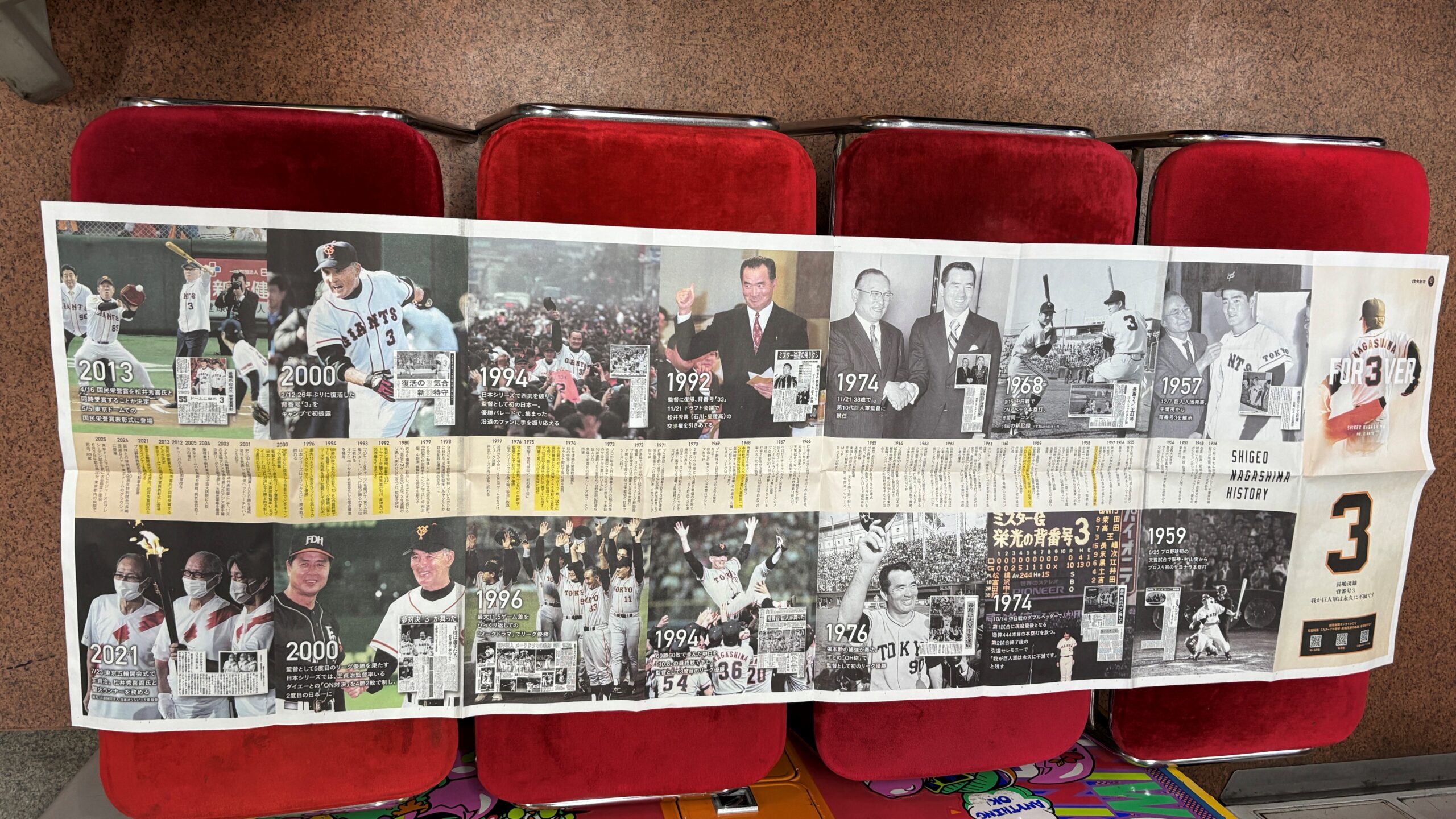 신문 네 장을 이어 붙인 160cm × 55cm 크기의 특대 지면에는 나가시마 씨의 연속 사진이 실려 있고, 뒷면에는 그의 눈부신 연표가 인쇄되어 있어 팬이라면 누구나 탐낼 만한 귀한 작품입니다.