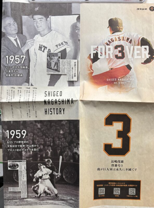The massive 160 cm × 55 cm spread—made up of four full newspaper pages—features a series of photos of Mr. Nagashima on the front and a brilliant chronological record of his legendary career on the back. It’s truly a collector’s item that any Nagashima fan would treasure.
