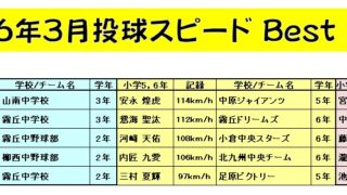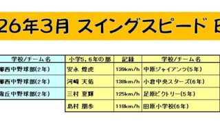★3月度投球スピード王総合の部 入木駿登 様 130Km/h中学生の部 千葉創太 君 116Km/h 山南中学校(3年)小学5-6年の部 安永煌虎 君 114Km/h 中原ジャイアンツ(5年)小学低/女性の部 宮脇有希 君 93Km/h 足...全文はクリック