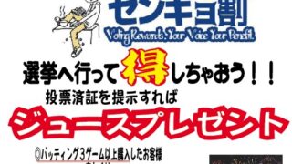 投票率アップを応援するためこの衆院選でも「センキョ割」キャンペーンを実施します!選挙で投票後に受け取れる投票済証を、以下の条件とともにカウンターでご提示いただくと、ジュース1本プレゼント!対象となるお客様◎バッティングを3ゲーム以上ご購入の...全文はクリック